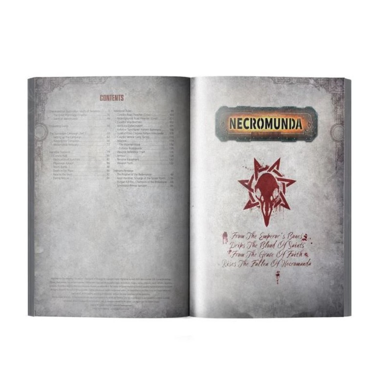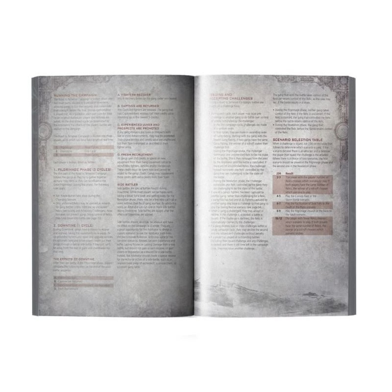 - Campagne The Road to Temenos (La route de Temenos) : Règles pour jouer une série de parties liées entre elles qui emmènent les joueurs à travers les événements du Grand Pèlerinage et la chasse pour obtenir - et employer - les légendaires Reliques de Necromunda, alors que la foi devient essentielle pour contrôler la population et gagner la guerre civile.