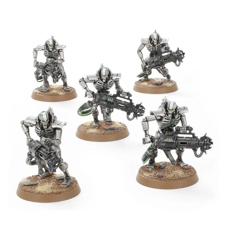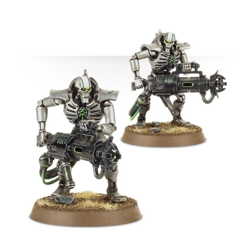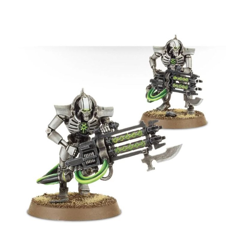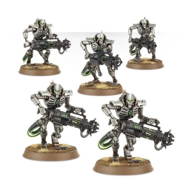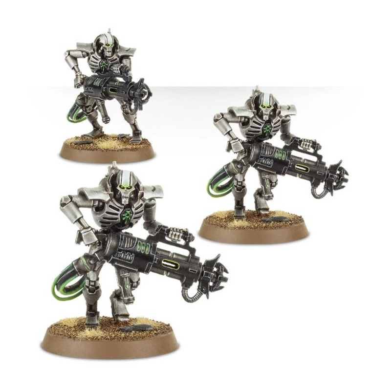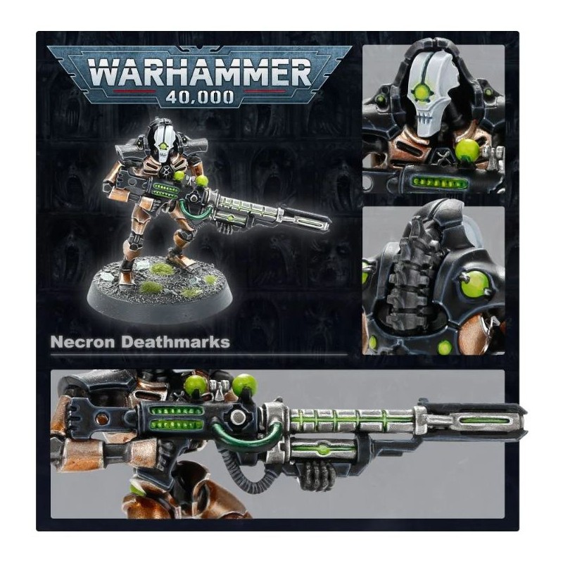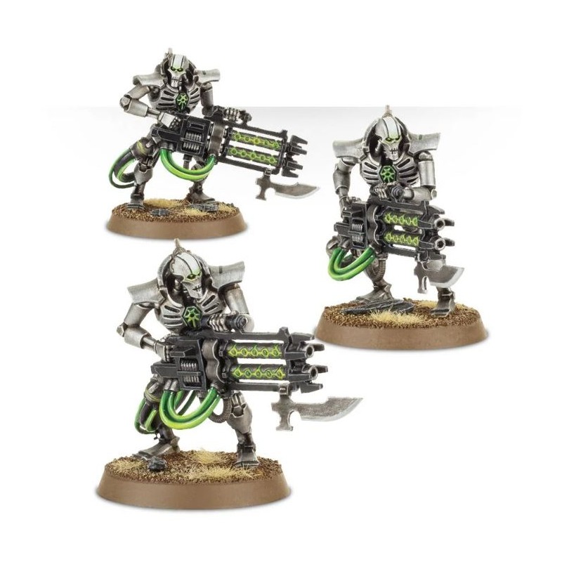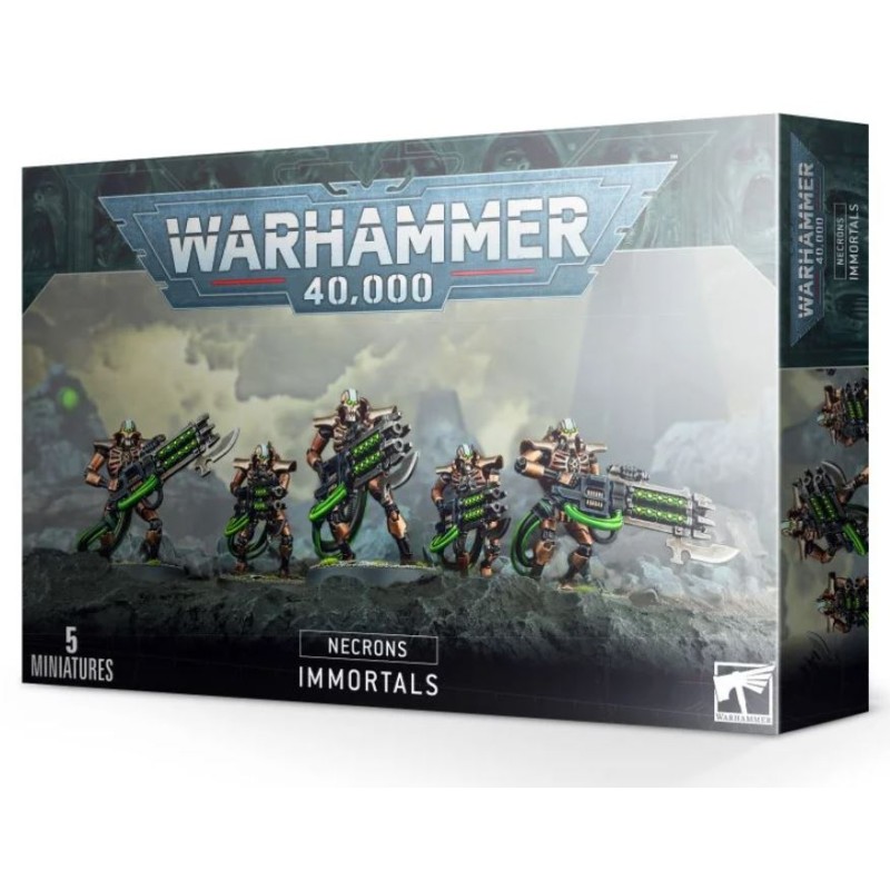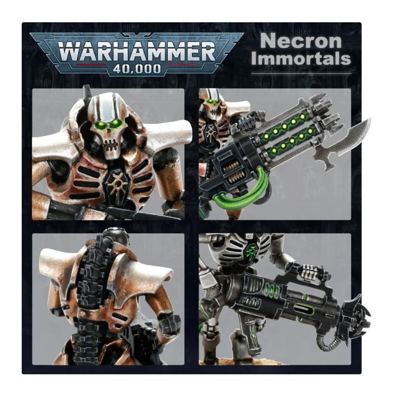 Les Necron Immortals ont le physique classique de squelette de métal propre à leur race. Leurs longs membres ont des écrous en guise d'articulations, leur posture voûtée les rend encore plus inquiétants, et leur tête est encastrée dans un logement blindé qu'encadrent leurs épaisses épaulières usinées. Leur plastron est frappé d'une sobre iconographie Necron. Les Immortals peuvent être équipés de terribles éclateurs gauss ou de carabines tesla.