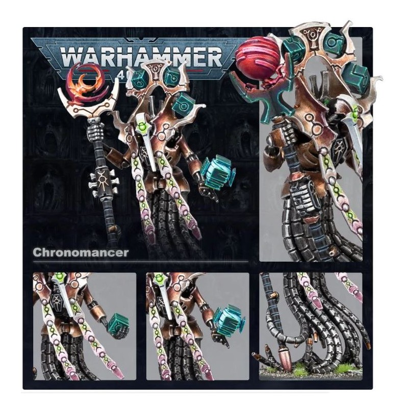 Les Chronomanciens sont des Crypteks qui exploitent l’énergie temporelle, leur sceptre des éons et leur lance d’entropie ralentissant ou accélérant le cours du temps en leur faveur. Leurs capes d’uchronie se servent d’instants cristallisés pour tromper les coups adverses tandis que leurs chronométrons pressent leurs alliés à travers le temps.