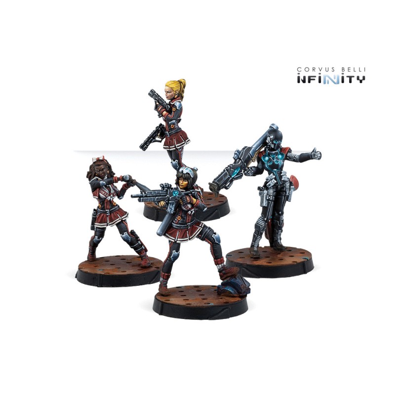 Ce blister contient 4 figurines en métal pour le jeu Infinity. Les socles sont inclus. Les figurines sont à assembler et à peindre.