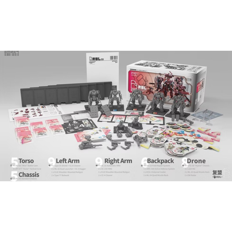 Cette Corebox RDL combine 5 méchas, 2 drones tactiques et un grand nombre de pièces modulaires interchangeables, offrant une large sélection d'armes, des stations de tir entièrement automatiques aux mitrailleuses lourdes, ainsi qu'un assortiment de sacs à dos et de noyaux auxiliaires qui peuvent donner à votre équipe un avantage tactique.
