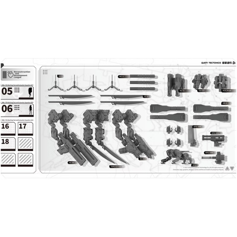 *Chaque pièce de mécha est livrée avec au moins une carte de pièce, certaines pièces ont plusieurs options, il y aura donc plus de cartes de pièces que de modèles. *Toutes les pièces sont livrées non assemblées et non peintes, et doivent être assemblées. Les outils d'assemblage et de peinture ne sont pas inclus dans le produit.