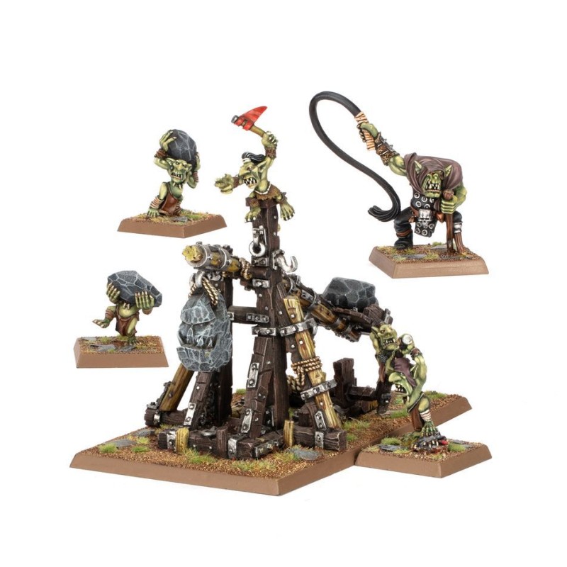 Cet kit en métal permet d'assembler un Lance-Rocs Gobelin, avec 3 servants gobelins et 1 Brute Orque pour que les premiers se tiennent à carreau. Le Lance-Rocs lui-même est représenté en train d'être apprêté par un autre gobelin, avec un observateur au regard perçant sis sur son faîte.