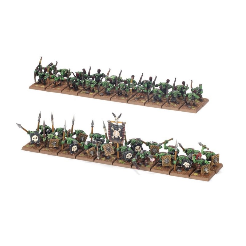 Ce kit est composé de 460 éléments en plastique et de 40x Socles Carrés Citadel de 25mm. Il contient également une Planche de Décalcos de Gobelins pour Warhammer: The Old World, proposant 84 décalcos de grande qualité pour décorer votre armée. Ces figurines sont fournies non peintes et nécessitent assemblage.