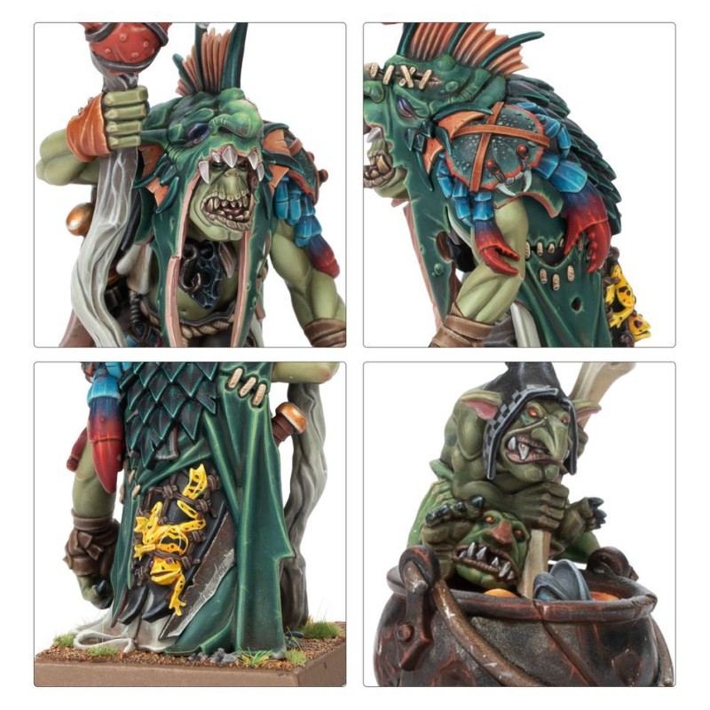 Ce kit en résine permet d’assembler Ogdruz Swampdigga, un sorcier qui apprécie les trolls pour les Tribus d’Orques & Gobelins dans Warhammer: The Old World. Cet imposant chamane a une affinité particulière pour les trolls, et il est vêtu de la peau d’un Troll d’Eau. Il emploie une magie surprenante à l’aide d’un bâton taillé dans du bois des marais et d’un familier snotling qui touille joyeusement une sinistre décoction.