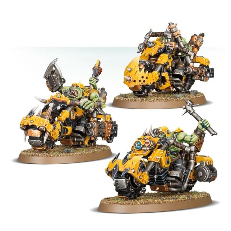 Cette boîte contient 3 Ork Warbikers en plastique, plus les options pour représenter un Nob à moto et de nombreux accessoires. Figurines fournies avec des socles ovales de 75mm.