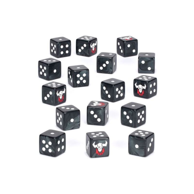 Ce produit est un set de 16 dés à six faces, aux angles carrés, utilisables dans les parties de Warhammer 40,000 et sur le thème de Ghazghkull Thraka. Ils sont moulés en plastique acrylique noir nacré avec des marquages blancs et rouge métallisé, et mesurent 16mm de côté. Les faces 1 à 5 sont numérotées de façon traditionnelle, et chaque face du 6 est ornée de l'icône brutale (mais ruzée) de Ghazghkull Thraka. Ces dés thématiques sont uniquement disponibles dans la limite des stocks.