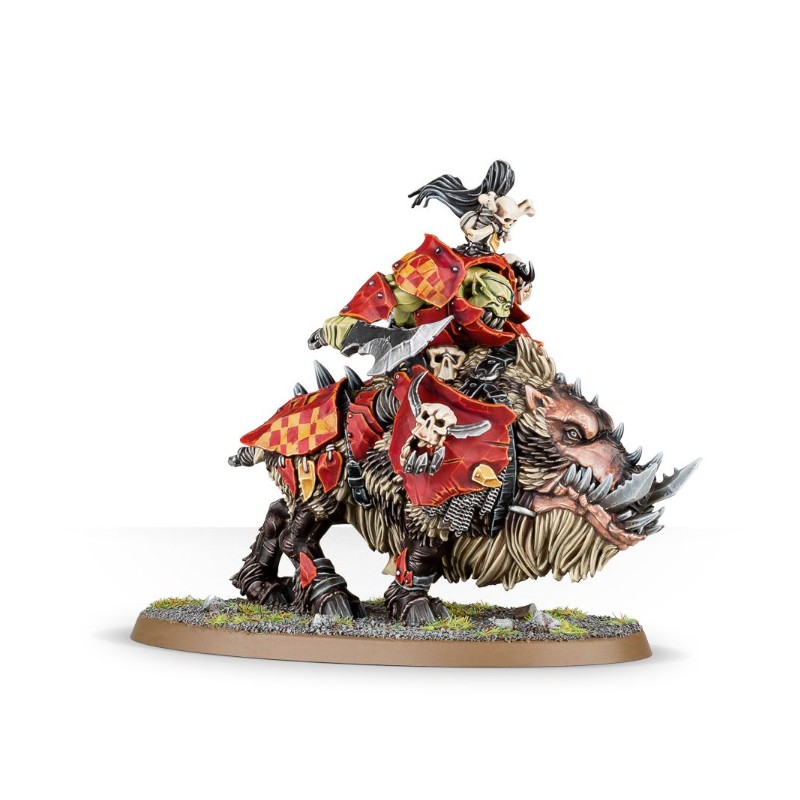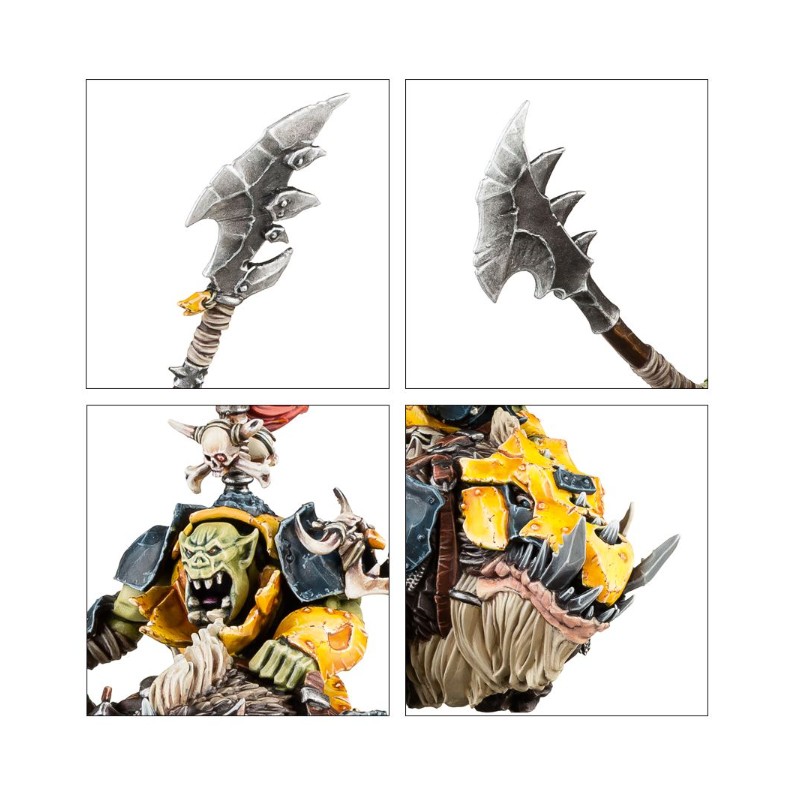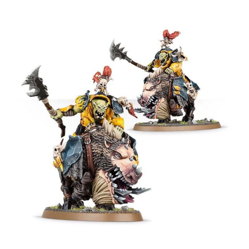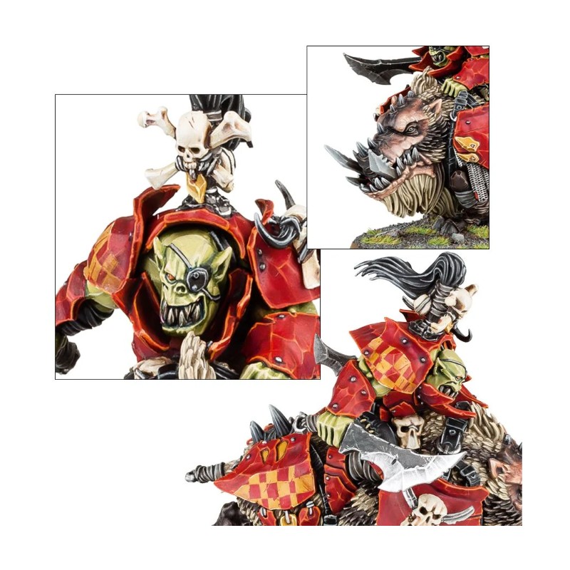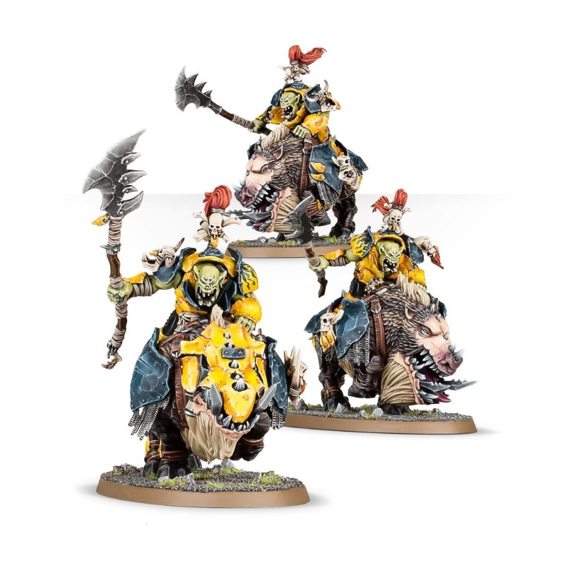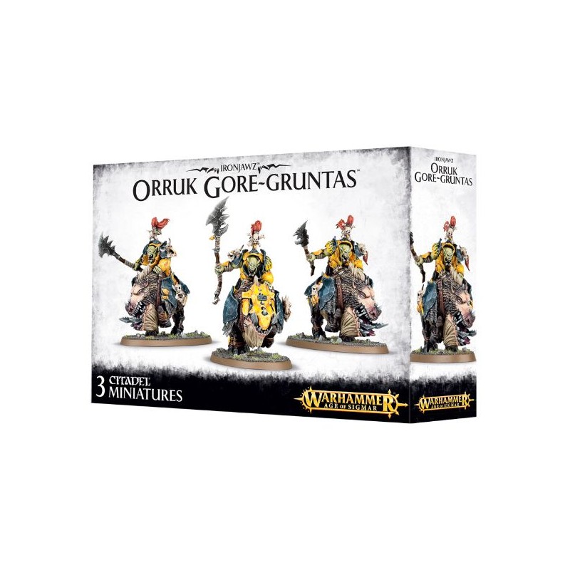Ce kit plastique contient toutes les pièces nécessaires pour assembler trois Gore-gruntas, des orruks sauvages montés sur d'énormes bêtes hargneuses tout en armure et en défenses. Les orruks peuvent être armés de kikoup' mastoks ou d'étripeurs dentelés, avec en option un Gore-grunta boss doté de ses propres variantes de tête, d'arme et de monture. 100 composants en tout, avec trois socles ovales Citadel de 90x52mm.