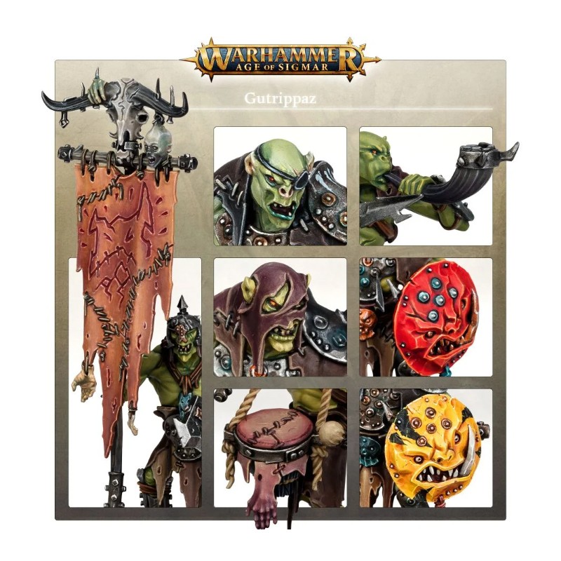 Le kit comporte en outre les options pour monter un Boss Éventreur, une bannière Éventreuse, et un choix de deux musiciens Éventreur. Le tout est fourni avec 10 socles ronds Citadel de 32mm. Ces figurines sont fournies non peintes et nécessitent assemblage.