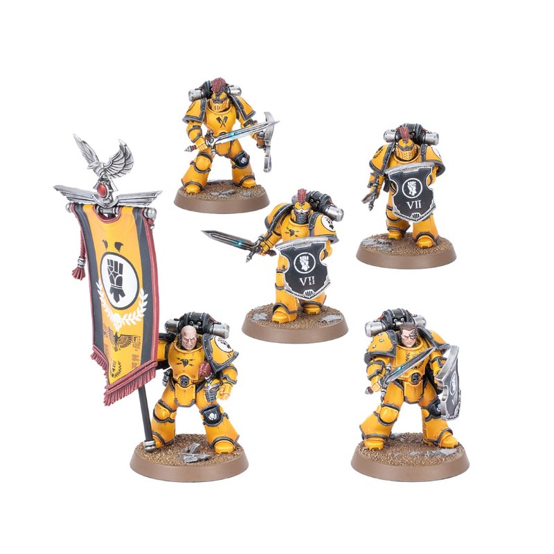 Ce kit en plastique permet d'assembler une Escouade d'État-major de cinq guerriers Élus. Toutes ces figurines portent une armure d'artificier MKIII, avec divers heaumes à cimier et d'impressionnantes épaulières qui indiquent leur statut. Une de ces figurines peut être assemblée comme Porte-étendard, avec un choix de deux étendards de Légion différents autour desquels vos troupes pourront se regrouper, et quatre fleurons pour les décorer: deux pour les Loyalistes, et deux pour les Renégats.