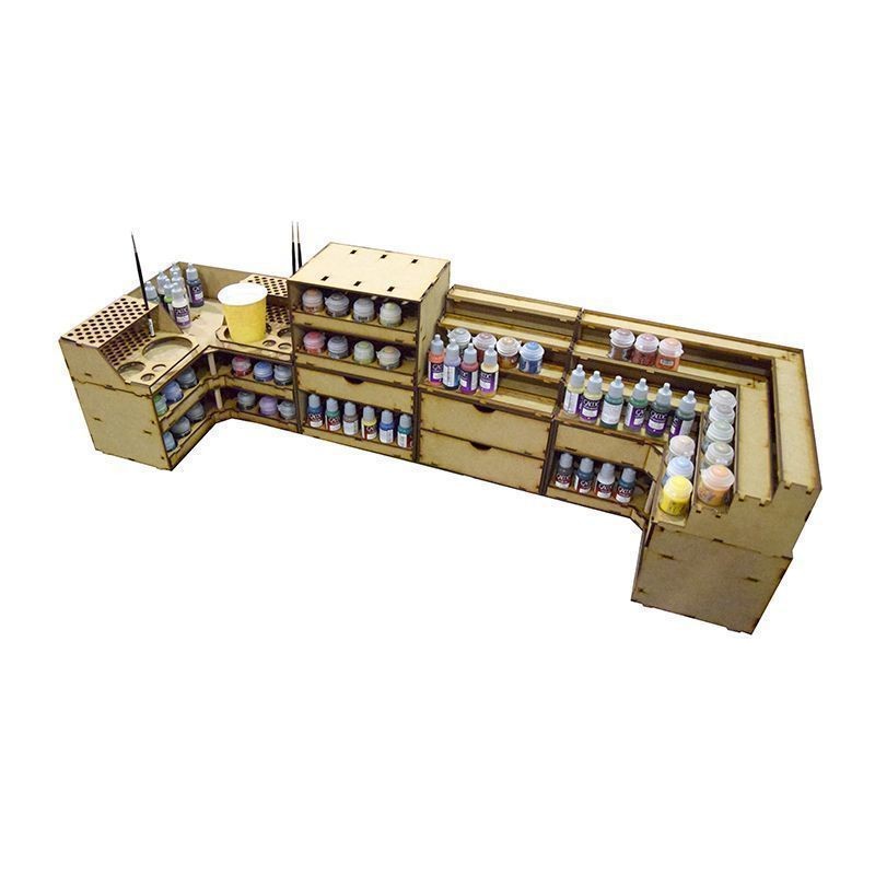 - 1 module d'angle de 30cm x 30cm pouvant recevoir les différents pots de peinture les plus utilisés sur le marché (Citadel, Prince August, Vallejo,...)