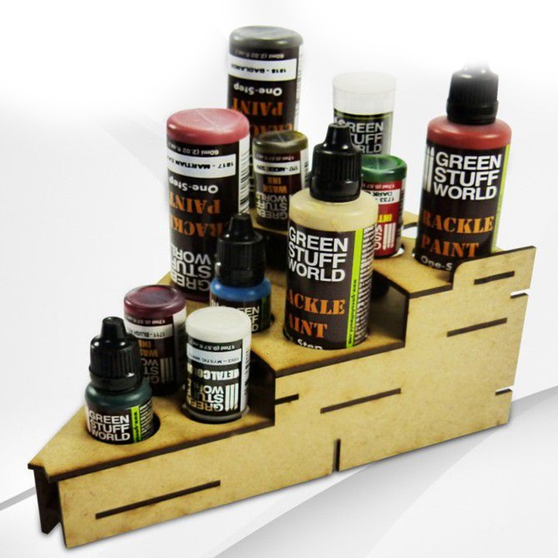 Présentoir de bouteilles de peinture fabriqué en bois MDF de haute qualité. L'assemblage pour ce présentoir est rapide et simple. Si vous souhaitez le renforcer, nous vous recommandons d'utiliser une colle blanche Standard. Cet ensemble comprend des pièces de connexion pour pouvoir le joindre à d’autres modules à gauche et à droite. Il est également compatible avec les modules de tiroir GSW.