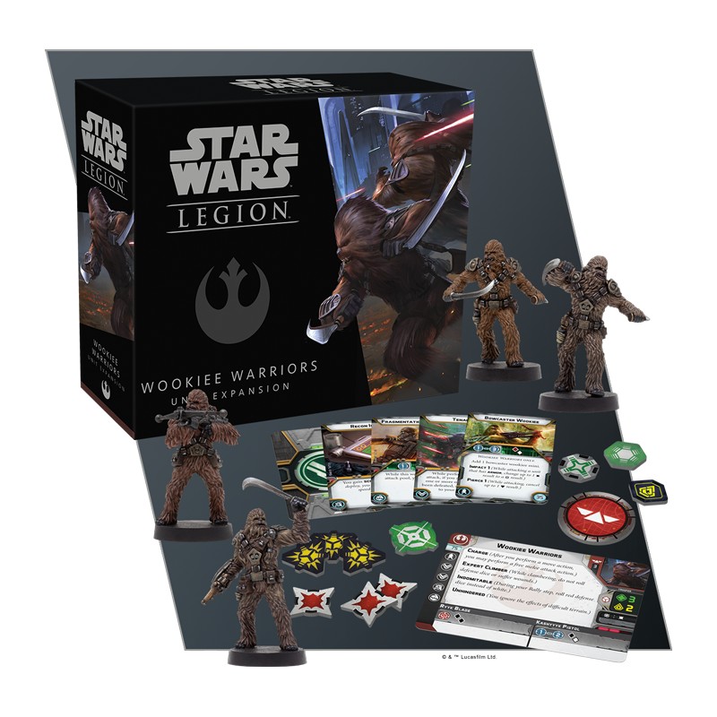 Dans cette extension, vous trouverez quatre figurines de Guerrier Wookie non peintes et faciles à assembler, prêtes à tester leur ténacité et leur détermination sur le champ de bataille. Déjà redoutables à elles seules, cinq cartes d’amélioration vous donnent la possibilité de renforcer encore plus leurs capacités. Enfin, une carte d’unité et une poignée de pions vous permettent d'incorporer complètement une unité de Guerriers Wookies au sein de vos armées. Poursuivons dès à présent cet article pour découvrir tout ce qu'un groupe de Guerriers Wookies procure à votre armée Rebelle !