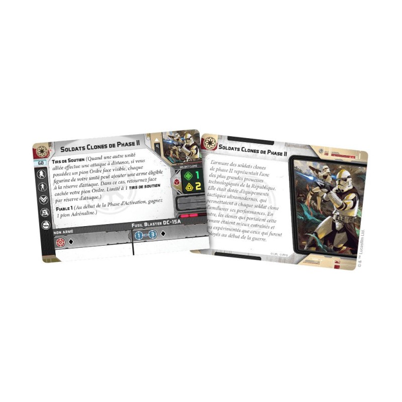 Cette extension contient tout ce dont vous aurez besoin pour ajouter une nouvelle unité de troupiers d’élite à vos armées de la République Galactique. Vous y trouverez sept figurines de Soldats Clones de Phase II en plastique dur, prêtes à affronter leurs ennemis sur le champ de bataille, dont un Soldat de Phase II avec Z-6 et un Soldat de Phase II avec Mortier. Certaines des figurines pourront être personnalisées selon vos préférences.