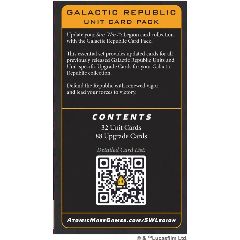 Galactique pour Star Wars™: Legion, le jeu de figurines. Renforcée par des améliorations et de nouvelles options tactiques, votre armée de la République Galactique sera plus compétitive et polyvalente que jamais, prête à challenger l'Alliance Séparatiste à chaque affrontement ! Complétez cet achat avec la référence, SWQ157 Galactic Republic Command Card Upgrade Pack.