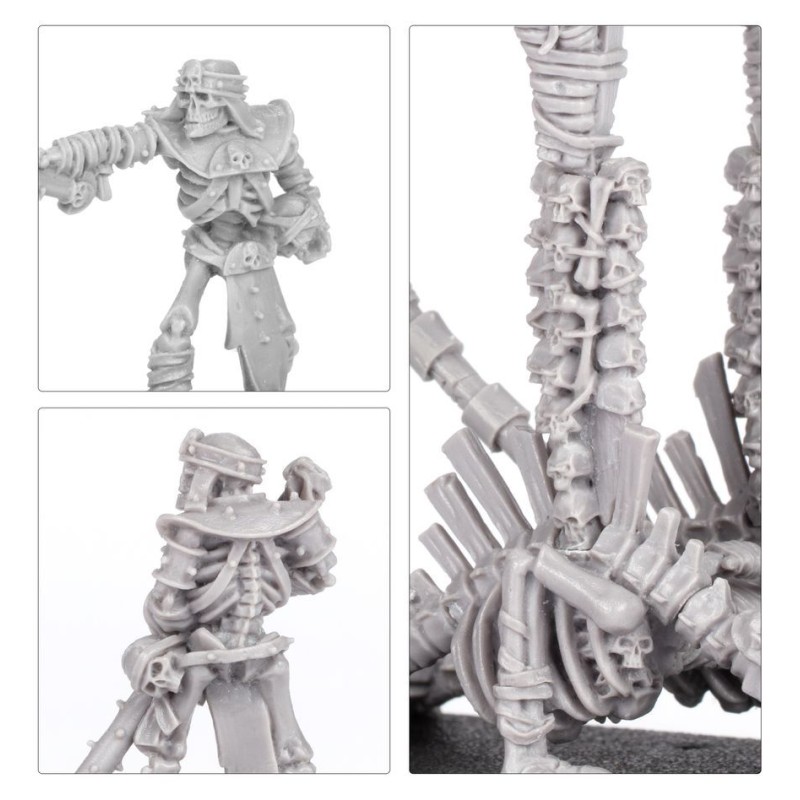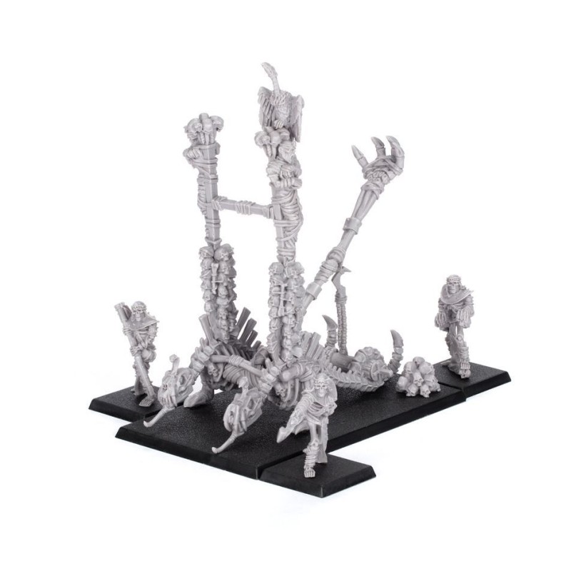 Ce kit en résine permet d'assembler une puissante Catapulte à Crânes Hurlants, ainsi que ses trois Servants Squelettes. Cette macabre machine de guerre est couverte de détails dérangeants, du vautour posé sur son cadre à la sinistre griffe qui surmonte son bras. Avec sa pile de crânes servant de munitions, c'est une arme de dévastation à très grande portée.