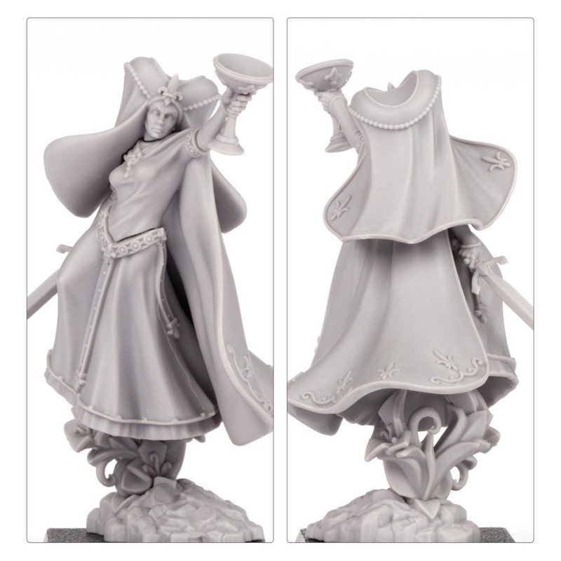 Ce kit en résine permet d'assembler une Servante de la Dame, un Sorcier pour votre armée du Royaume de Bretonnie. Elle peut représenter une Prophétesse ou une Damoiselle, et elle est équipée d'une arme de base. Vous trouverez deux options de tête, dont une dotée d'une longue coiffe, et deux options pour chaque main: la gauche peut brandir un sceptre ou un calice, et la droite peut porter une épée ou être ouverte et vide.Quel que soit son équpement, son arme la plus puissante est sa magie qui lui permet de secourrir ses alliés et d'abattre ses ennemis.