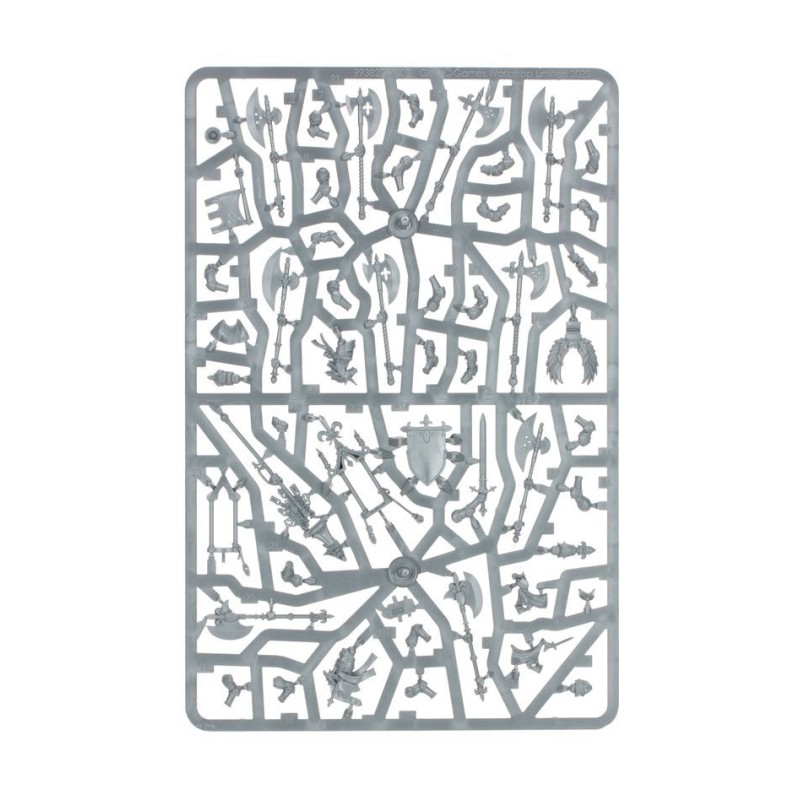 Vous trouverez les éléments nécessaires pour assembler deux améliorations d'état-major, dont des Champions du Royaume (les champions d'unité), des porte-étendard et des musiciens. Cela vous permet de les assembler comme une seule grosse unité de 20 chevaliers ou deux unitès plus petites de 10. Chaque guerrier peut être équipé d'un arme lourde ou d'une arme de base et d'un bouclier, et le kit contient de nombreux choix de têtes, ce qui vous permer de personnaliser vos unités.