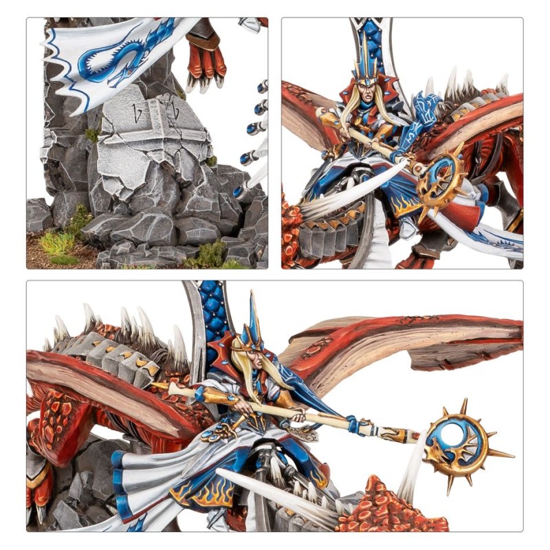 Ce kit en plastique permet d'assembler un Seigneur sur Dragon Lunaire ou Solaire, pouvant servir à représenter un Prince dans les armées des Royaumes Hauts Elfes à Warhammer: The Old World. À la fois terribles et gracieuses, ces féroces créatures sont craintes de tous ceux qui compteraient s'opposer aux Hauts Elfes, et leurs cavaliers font de parfaits généraux pour les armées les plus grandes. Vous pouvez autrement assembler le cavalier comme un Archimage sur Dragon Lunaire ou Solaire, ou comme un Mage Dragon sur Dragon Stellaire, combinant la magie et un monstre afin de vous ouvrir encore plus d'options tactiques.
