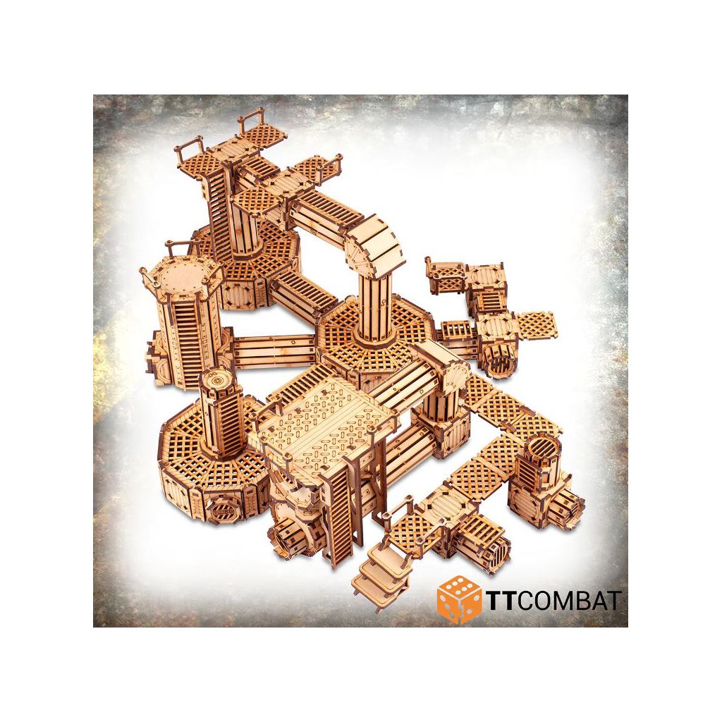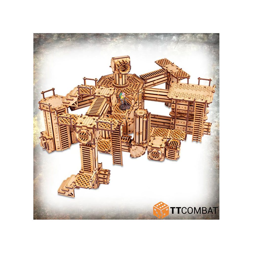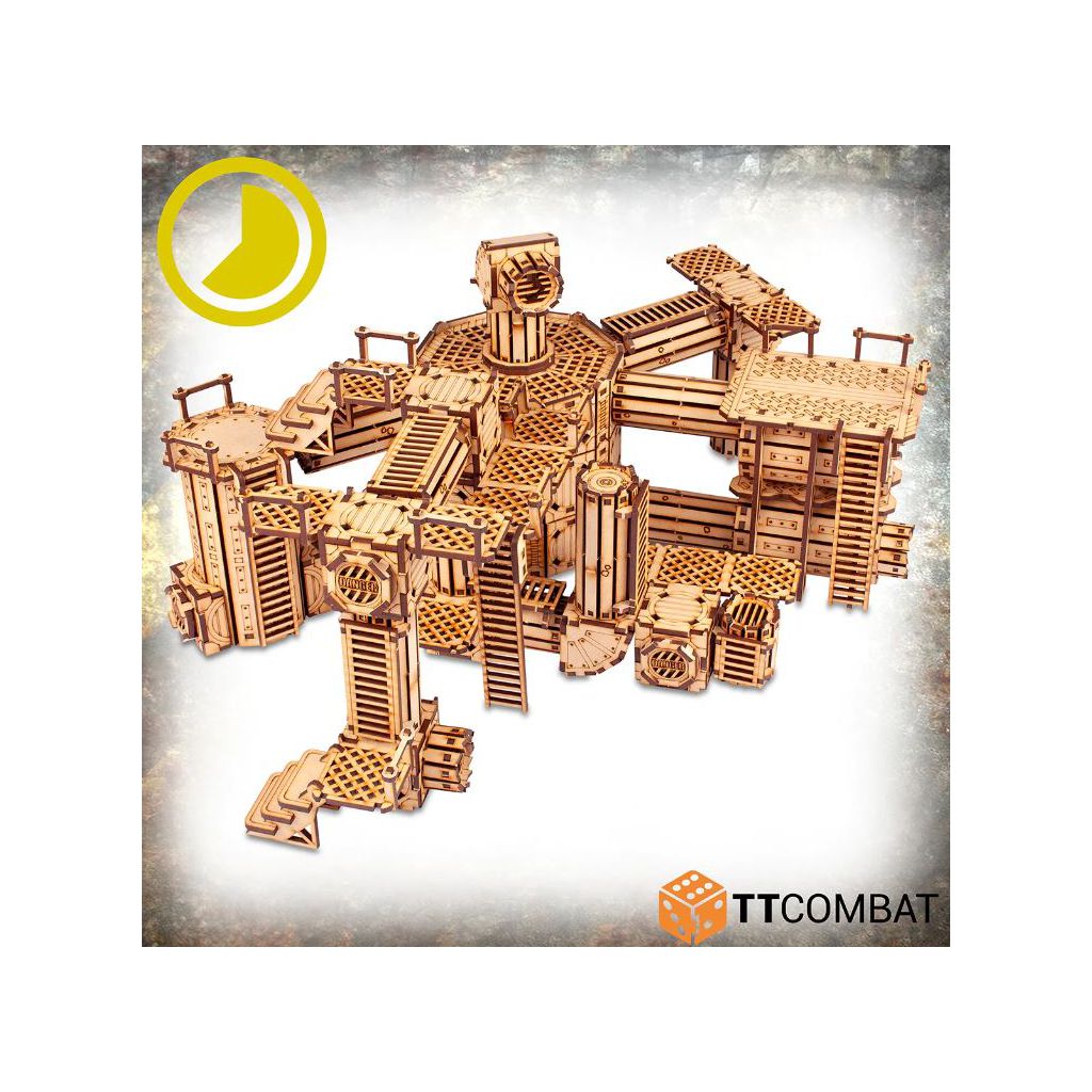 Tous les kits de la Ruche Industrielle sont conçus pour fonctionner ensemble, en utilisant un système de clip innovant pour permettre à chaque pièce de se fixer à une autre. En utilisant la modularité intégrée, vous pouvez attacher des escaliers, des passerelles, des plateformes, des bureaux, des tuyaux, des silos et des murs, le tout dans une masse continue de métal (enfin, de MDF) pour créer littéralement des milliards d'agencements différents. Toute cette modularité rendra vos parties dans la ruche industrielle tentaculaire plus amusantes que jamais.