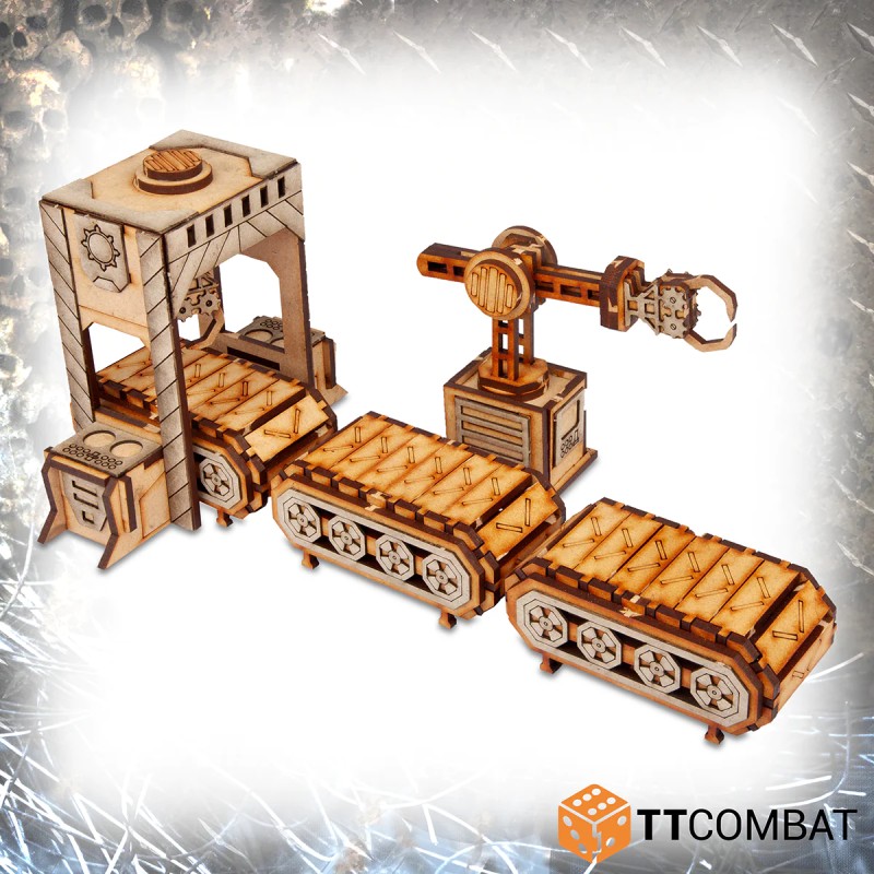 D'une hauteur d'environ 24 cm, il est parfait pour les jeux à l'échelle 28-32 mm. Fabriqué en MDF de 3 mm et en carton gris de 1 mm, il est facile à assembler et a fière allure sur le plateau de jeu. Le kit contient une tour Macerator, une griffe de préhension, un bras de préhension, 3 convoyeurs, 2 caisses, 2 boîtes.