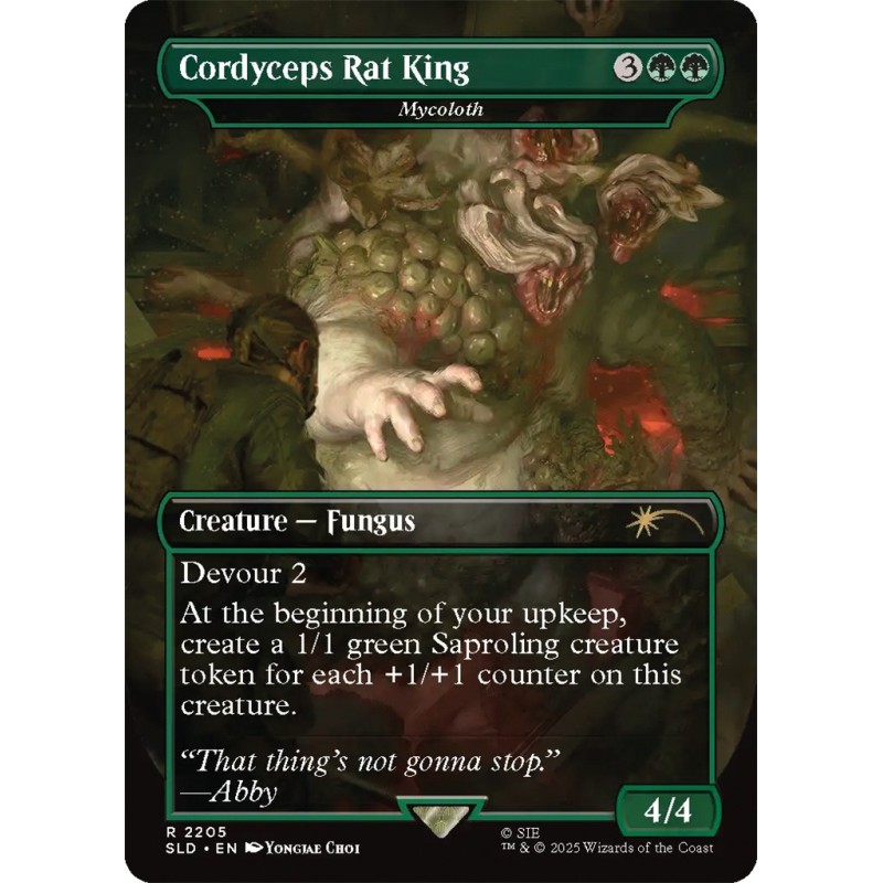 La suite très attendue de The Last of Us a ramené les fans dans un monde à jamais changé par l'infection Cordyceps, et retrouvé leurs personnages préférés quatre ans plus tard. Cette édition Secret Lair contient deux survivantes liées par le sang, avec de nouvelles cartes conçues pour Ellie et Abby qui explorent les concepts de vengeance et de perspective. De plus, gardez vos pions sacrificiels à un niveau élevé avec Mycoloth en tant que « Cordyceps Rat King », puis faites vraiment payer le prix du sacrifice à votre adversaire avec Dictate of Erebos en tant que « Ellie's Rage ». (Et bien sûr, le jeton obligatoire Cordyceps Infected qui peut être la cible d'une brique errante).