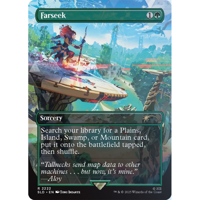 En plus d’une carte Magic inédite à l’effigie de la plus grande chasseuse de machines de l’histoire, le drop Secret Lair x Horizon: Into the Forbidden West comprend aussi les saisissants colosses mécaniques qui ont fait la renommée de la franchise. Prenez de la hauteur sur un Grand-cou avec Farseek, et jouez un Blightsteel Colossus sous les traits de l’antique machine de guerre « FAS-BOR7 Horus », ou un Meteor Golem en tant que « Thunderjaw ». Et avec Tarrian’s Soulcleaver en tant que « Regalla’s Wrath », l’arc qu’Aloy reçoit au Kulrut, vous pouvez vous assurer que la sauveuse de Meridian sera bien équipée pour partir vers l’ouest.
