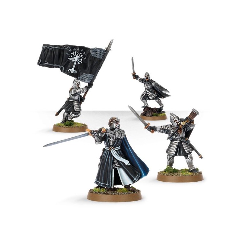 Cette boîte contient des Gondor Commanders, des figurines en résine, dont un Captain of Minas Tirith, un Warrior avec cor de guerre, un Warrior avec bannière et un Knight of the White Tower, le tout en 7 composants, fournis avec quatre socles ronds de 25 mm.