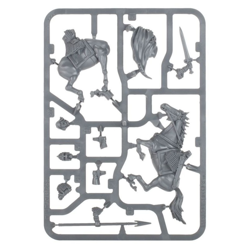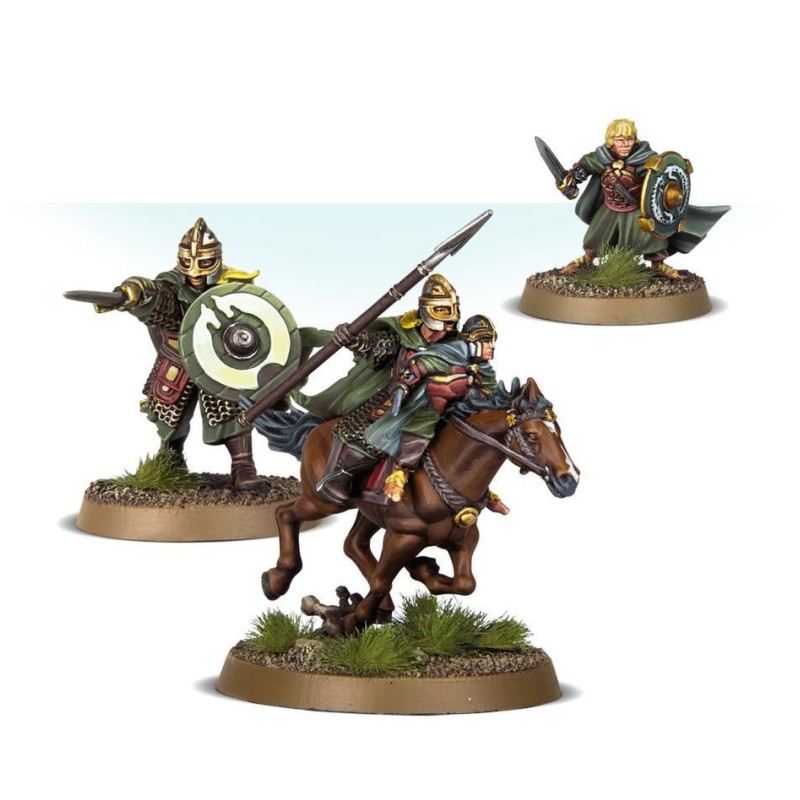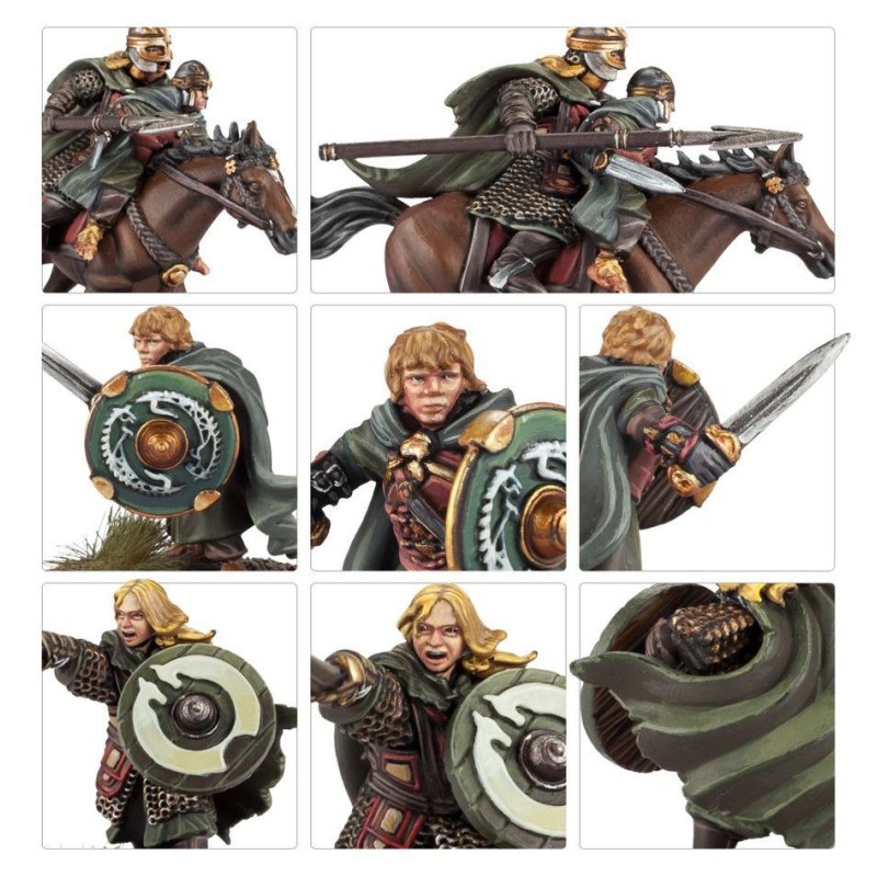 Ce kit plastique contient les composants nécessaires pour assembler Éowyn et Merry, aussi bien à pied qu'à cheval. En version montée, vous avez l'option de retirer Merry pour ne laisser qu'Éowyn. À pied, Éowyn porte une épée et un bouclier, auxquels s'ajoute un javelot quand elle est à cheval. Merry porte l'uniforme d'un Écuyer du Rohan et il a lui aussi une épée et un bouclier. Les deux versions d'Éowyn peuvent être assemblées tête nue avec sa chevelure d'or exposée, ou avec un heaume sous son identité de Dernhelm.