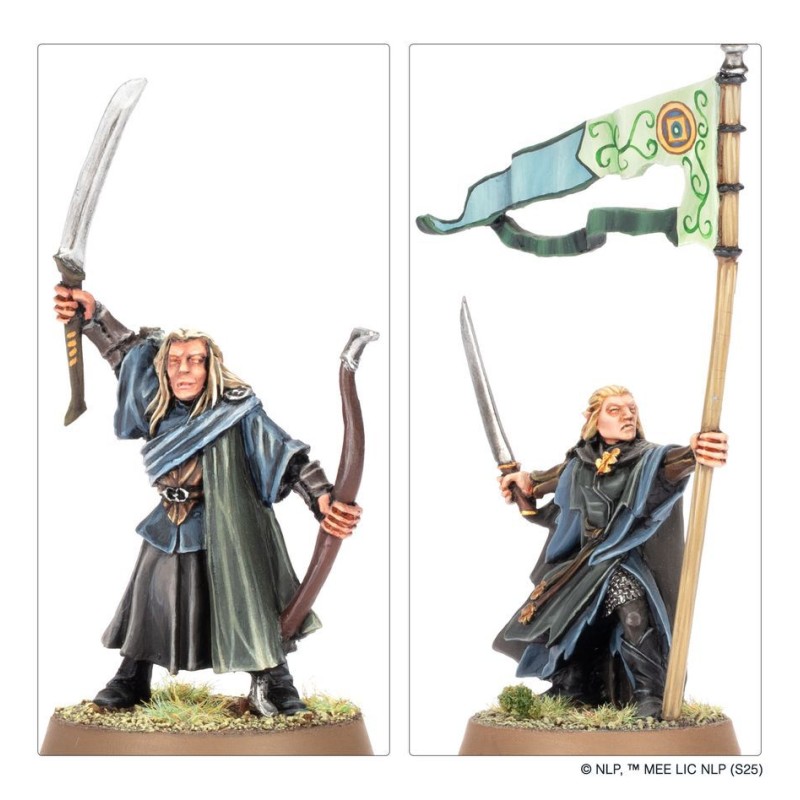 Ce kit en métal permet d'assembler un Captain, et un guerrier porteur de bannière, pour mener vos armées de la Lothlórien. Ces Héros talentueux soutiennent vos combattants elfiques déjà puissants en renforçant leurs capacités offensives.