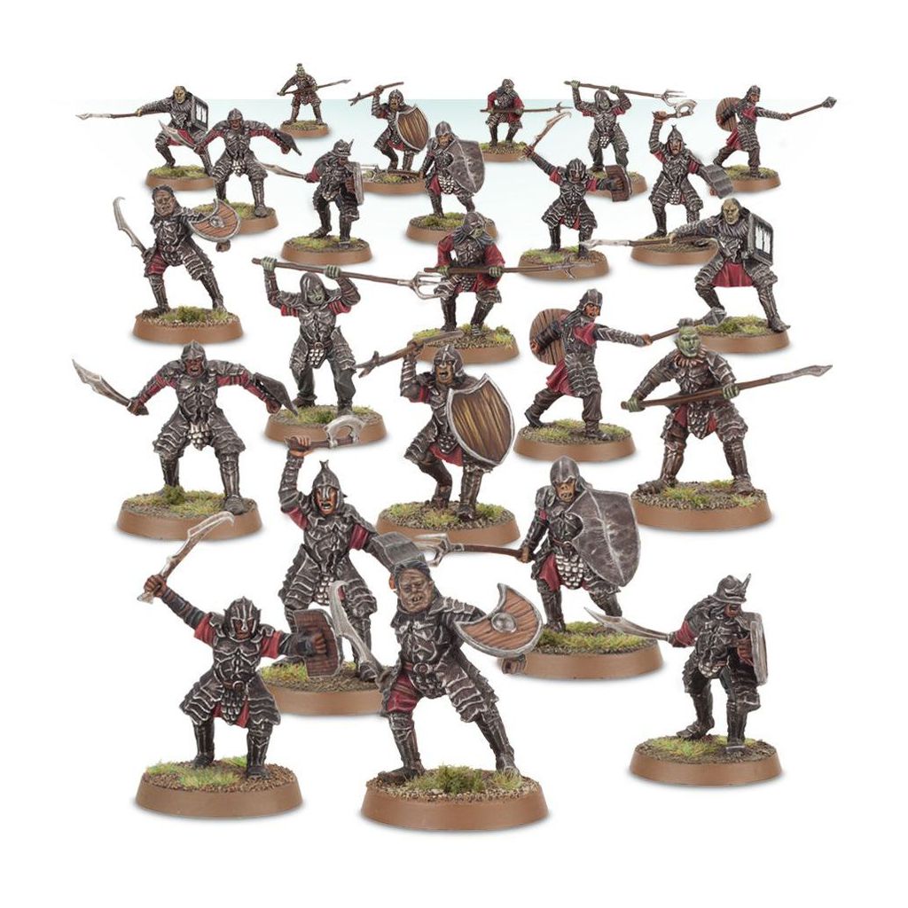 Cette boîte contient 40 composants avec lesquels assembler 24 Orques du Morannon plastique : 12 avec arme de base et bouclier, et 12 avec lance et bouclier. Ils sont fournis avec 24 socles ronds de 25mm. Figurines à assembler et à peindre.