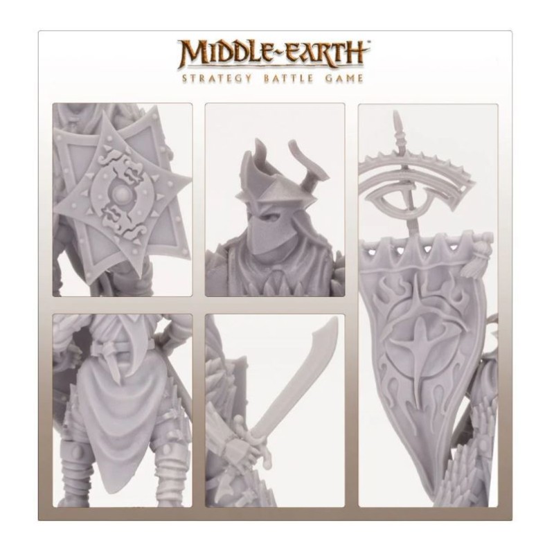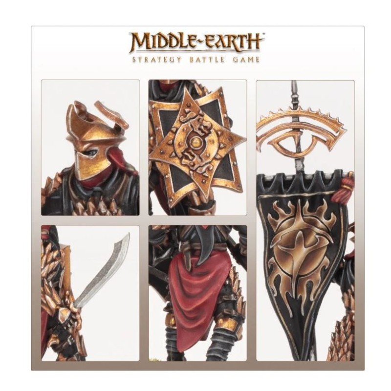 Ce kit en résine en plusieurs parties permet d'assembler six guerriers dragons noirs finement détaillés, armés d'une armure lourde, de boucliers et d'une épée ou d'une pique. Un guerrier peut être assemblé avec une bannière, une épée et un bouclier en bandoulière. Chaque armée orientale voudra un cadre de ces guerriers vicieux sur les lignes de front - ils sont plus forts et plus résistants que les guerriers orientaux normaux, et possèdent également des boucliers, des armures et des casques plus ornés, leur donnant une apparence distinctement sinistre sur le champ de bataille. Ces modèles peuvent également être utilisés pour représenter les porteurs de palanquin de l'Empereur Dragon de Rhûn, lorsqu'il met pied à terre.