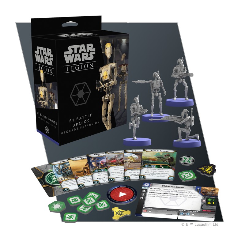 L'extension d'amélioration des droïdes de combat B1 contient quatre droïdes de combat B1 non peints et finement sculptés, différents de ceux que l'on trouve dans le jeu de base de la Guerre des clones ou dans l'extension d'unité des droïdes de combat B1. Ces figurines sont livrées sur châssis, ce qui vous permet de personnaliser leur apparence. Sur le champ de bataille, ces figurines peuvent devenir la base d'une nouvelle unité de droïdes de combat B1, ou vous pouvez utiliser les nouvelles options d'armes lourdes et de cartes d'amélioration du personnel qu'elles apportent pour améliorer vos unités existantes.