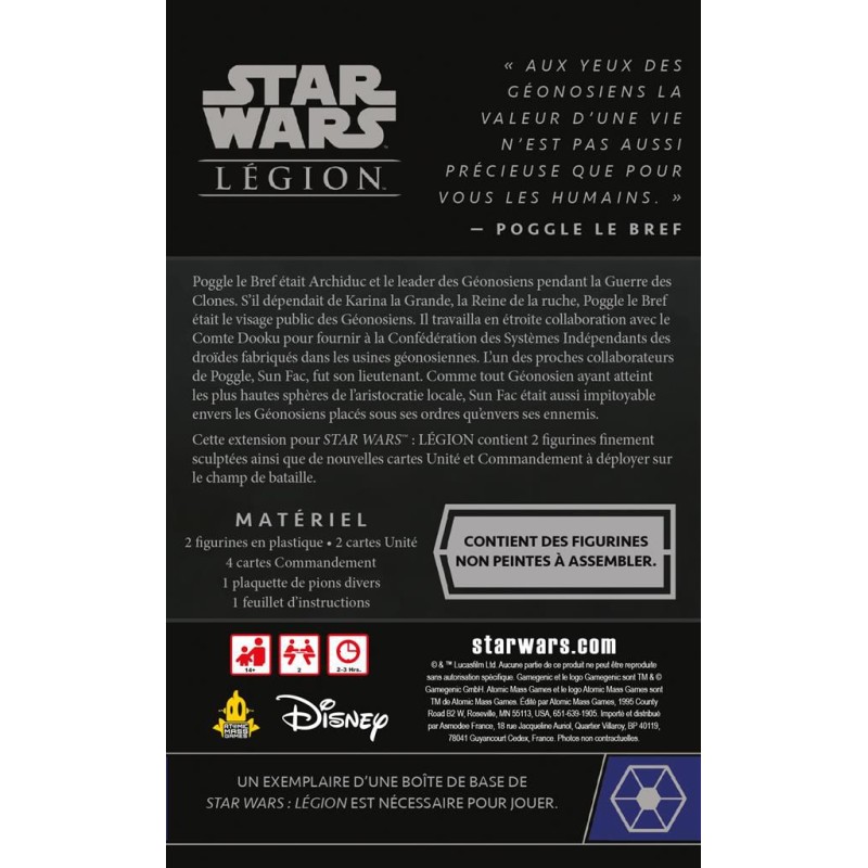 Description du produitPoggle le Bref était Archiduc et le leader des Géonosiens pendant la Guerre des Clones. S’il dépendait de Karina la Grande, la Reine de la ruche, Poggle le Bref était le visage public des Géonosiens. Il travailla en étroite collaboration avec le Comte Dooku pour fournir à la Confédération des Systèmes Indépendants des droïdes fabriqués dans les usines géonosiennes. L’un des proches collaborateurs de Poggle, Sun Fac, fut son lieutenant. Comme tout Géonosien ayant atteint les plus hautes sphères de l’aristocratie locale, Sun Fac était aussi impitoyable envers les Géonosiens placés sous ses ordres qu’envers ses ennemis.