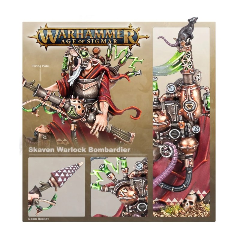 Mi-sorcier, mi-artillerie, tout en ingéniosité skaven, le Warlock Bombardier est un formidable Héros de soutien pour votre armée skaven. Idéal pour appuyer des Warp Lightning Cannons, des Stormfiends et des Warplock Jezzails, le Warlock Bombardier volatilise vos ennemis (et parfois lui-même) à la fusée funeste, tout en insistant avec ses éclairs pour faire bonne mesure. Si vous aimeriez jouer un des Héros skavens les plus imprévisibles (et mortels!), cette figurine est faite pour vous.