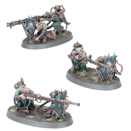 Ce kit en plastique permet d'assembler trois équipes de Jezzails à Malepierre, des unités de tir habiles pour votre armée de Skavens. Ces assassins à longue portée aiment abattre l'ennemi depuis une distance prudente, et leurs boucliers les rendent étonnamment résistants. Tous les porteurs de boucliers s'adaptent à n'importe lequel des artilleurs du kit, et vous trouverez les options permettant d'assembler un champion avec une arme à double canon, ce qui vous permet de personnaliser facilement votre unité.