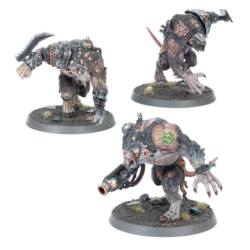 Ce kit en plastique permet d'assembler trois Rats-ogors, des troupes de choc enragées pour votre horde de Skavens. Vous pouvez armer l'un de ces monstres colossaux d'un canon à maleflamme, et le kit propose des options de têtes casquées ou nues pour chaque Rat-ogor.