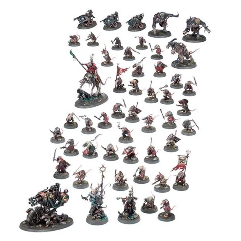 - 40x Rats des Clans – Les Rats des Clans sont la lie de la société skaven, que leurs maîtres considèrent comme parfaitement sacrifiables. Animés par la faim, la peur et l'ambition et armés de toutes les lames rouillées sur lesquelles ils ont pu mettre la patte, les Rats de Clans poursuivent le combat, quel que soit le nombre d'entre eux qui se font écraser, transpercer ou découper.