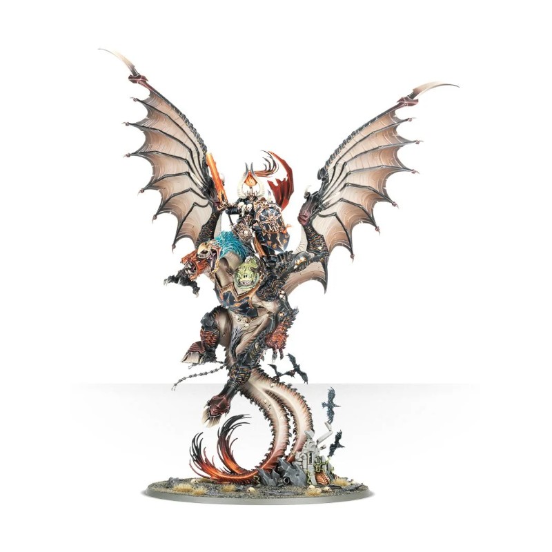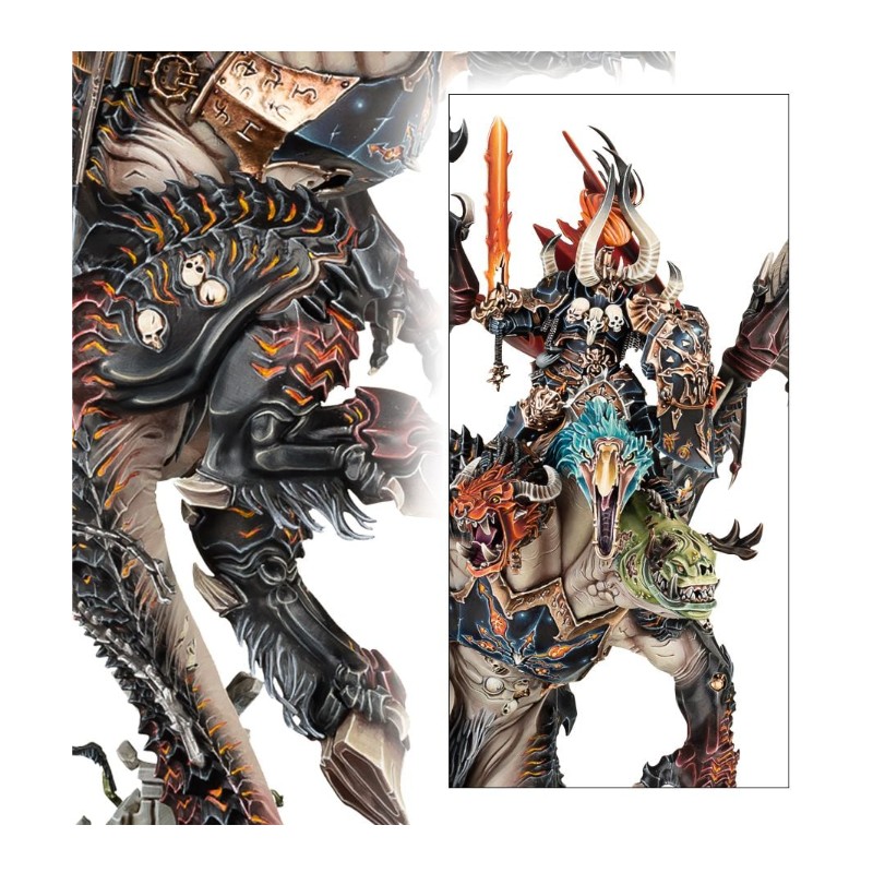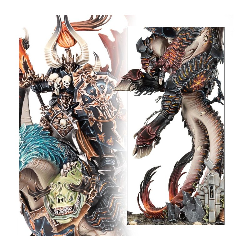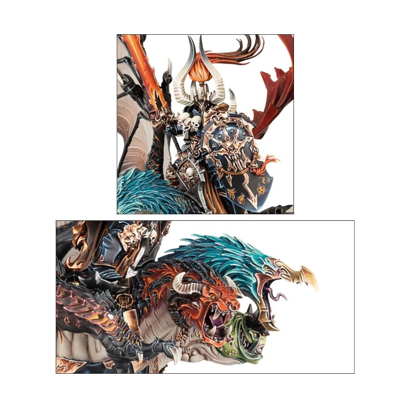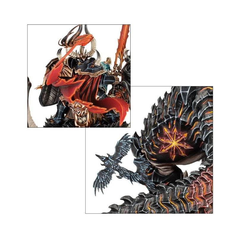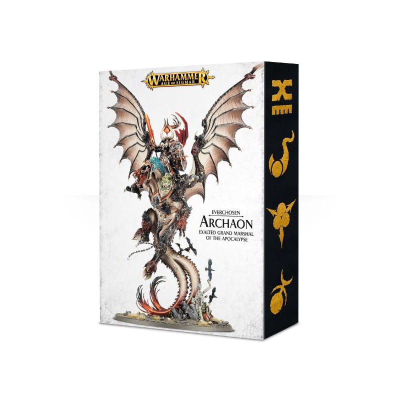 Ce kit contient toutes les pièces nécessaires pour assembler l'immense, le colossal, le majestueux Archaon, l'Élu des Dieux. Couvert de présents par les dieux sombres, il porte l'Armure de Morkar aux multiples marques du Chaos, incrustée de runes de sauvegarde et de malfaisance. Son pavois arbore les symboles des dieux sombres, et il étreint la Tueuse de Rois. Son énorme monture ailée, Dorghar, a subi d'horribles mutations en consommant l'âme et la carcasse des ennemis d'Archaon: des ailes gigantesques, un cuir incrusté des visages des malheureux Stormcast Eternals dont il a absorbé l'âme, trois têtes démoniaques et une queue bifide.