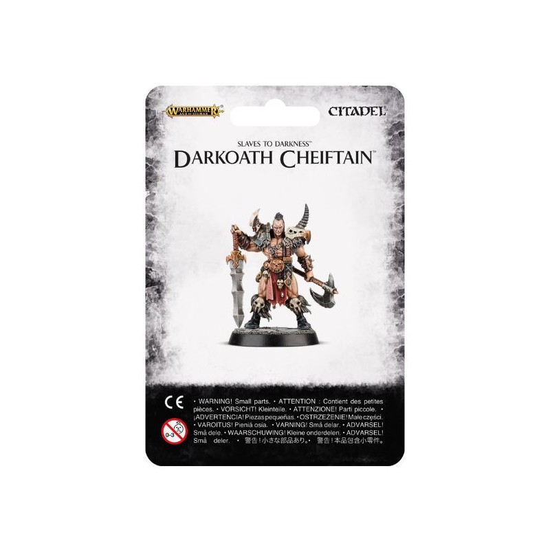 Ce kit plastique permet d'assembler un Chef de Guerre Noir-serment, un puissant commandant du Chaos honoré par ses pairs barbares. Vêtu de fourrures et de cuir, il exhibe sa musculature qui témoigne de sa force prodigieuse. Ce guerrier réputé se tient la main posée sur une énorme spathe maudite. Son autre main peut tenir soit une hache de seigneur de guerre, soit la tête tranchée de sa dernière victime.