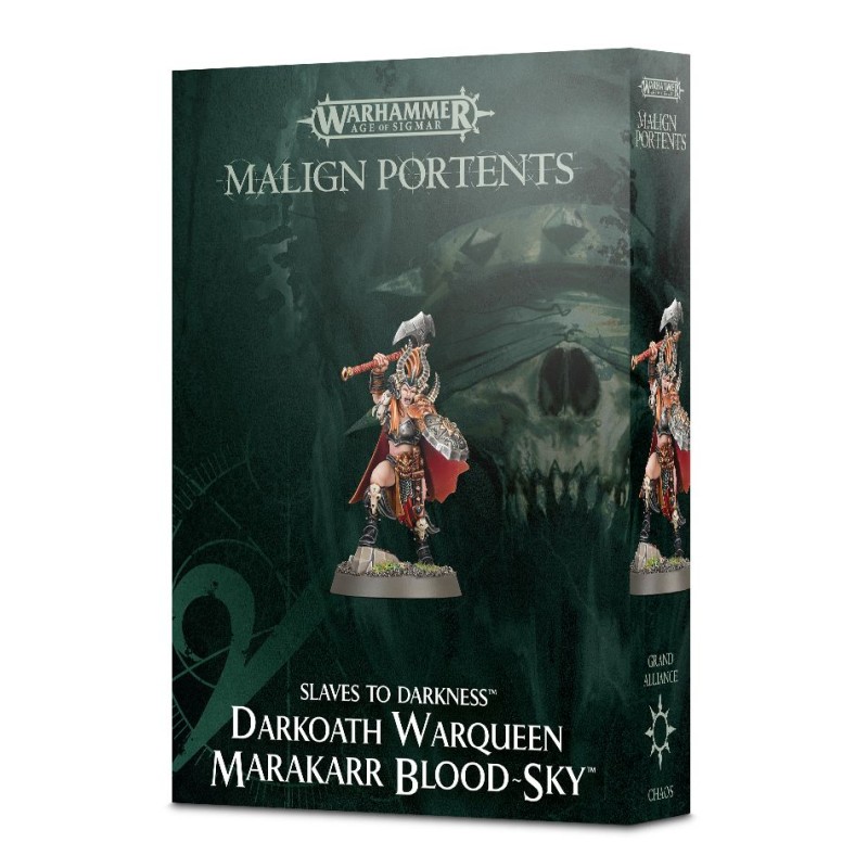 Ce kit plastique contient les composants nécessaires pour assembler Marakarr Blood-sky, une Darkoath Warqueen. Sa couronne à grandes cornes témoigne de son autorité sur les Slaves to Darkness. Son armure peut être qualifiée de fonctionnelle encore que légère – cuir clouté, mailles et plaques la protègent partiellement, et ce qu'on voit de sa peau porte les stigmates d'une vie passée à tuer et à collecter des crânes (dont elle conserve quelques exemplaires comme ornements). Pour témoigner de sa timidité toute relative, Markarr Blood-sky adopte une posture dynamique, en brandissant sa hache de seigneur de guerre (rayée et ébréchée par des années à taillader l'ennemi) et son bouclier runique infernal – ce dernier se divise en 8 sections, représentant les vents de magie. Sa longue cape est incrustée de tablettes de pierre, qui symbolisent autant de serments inviolables aux dieux sombres.