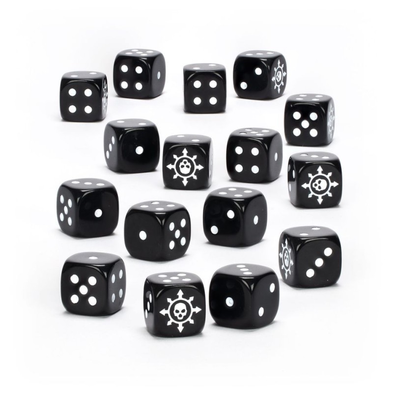 Chaque dé mesure 16mm de côté, présente des arêtes arrondies et est moulé en plastique noir. Les marquages ressortent grâce à leur couleur blanche, et la face du 6 arbore l'icône des Esclaves des Ténèbres.