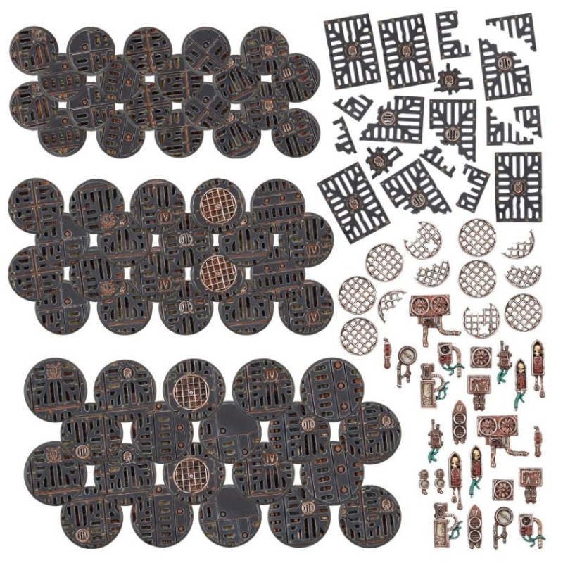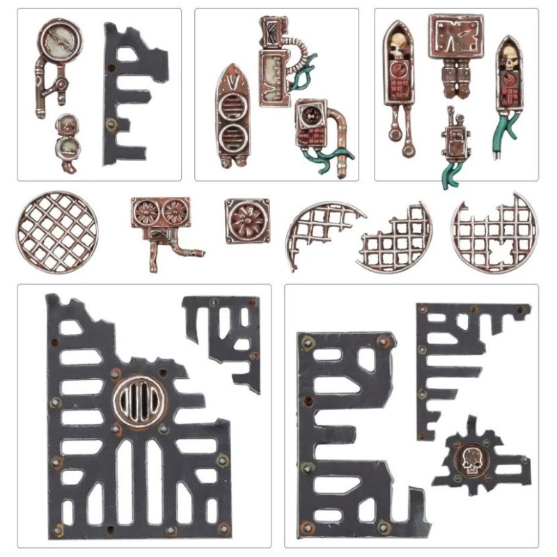 En plus des socles, ce kit contient de nombreux éléments de matériel de soclage sinistres et industriels pour ajouter des détails et des éléments narratifs à vos figurines, comme des sections de machinerie, des grilles brisées, des ventilateurs abandonnés, des jauges cassées et des relais vox usés.