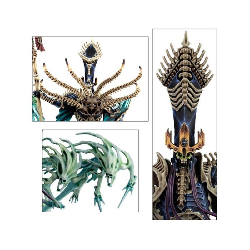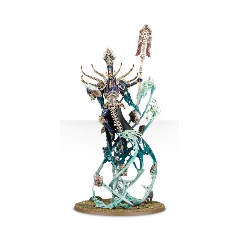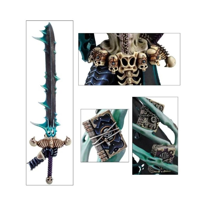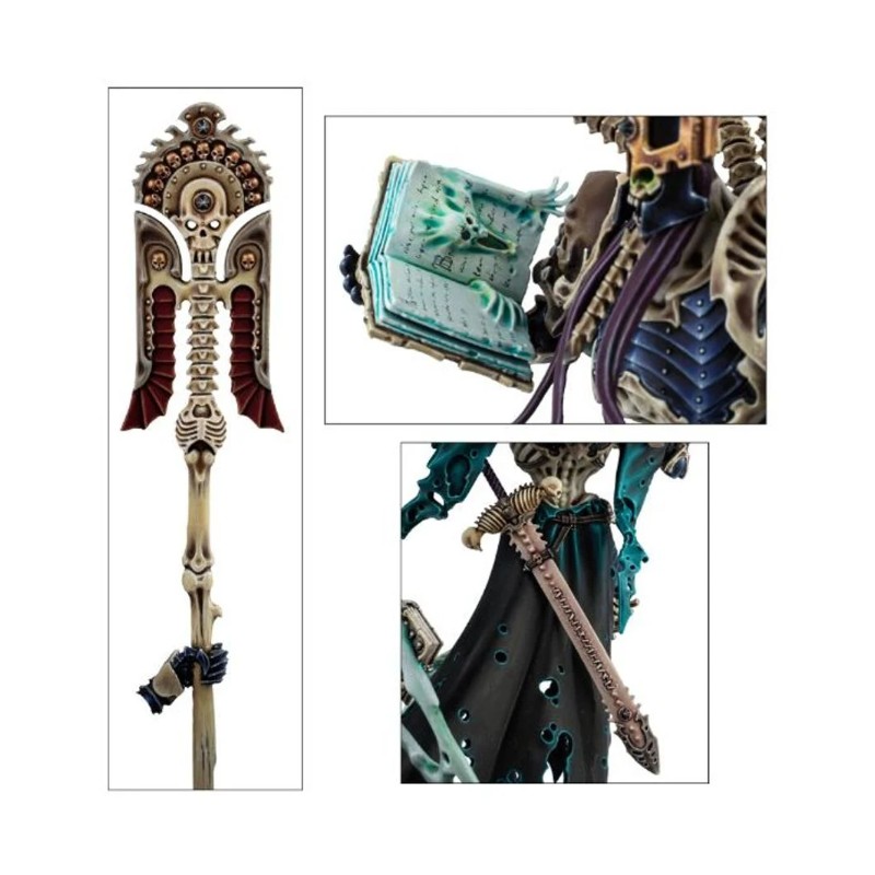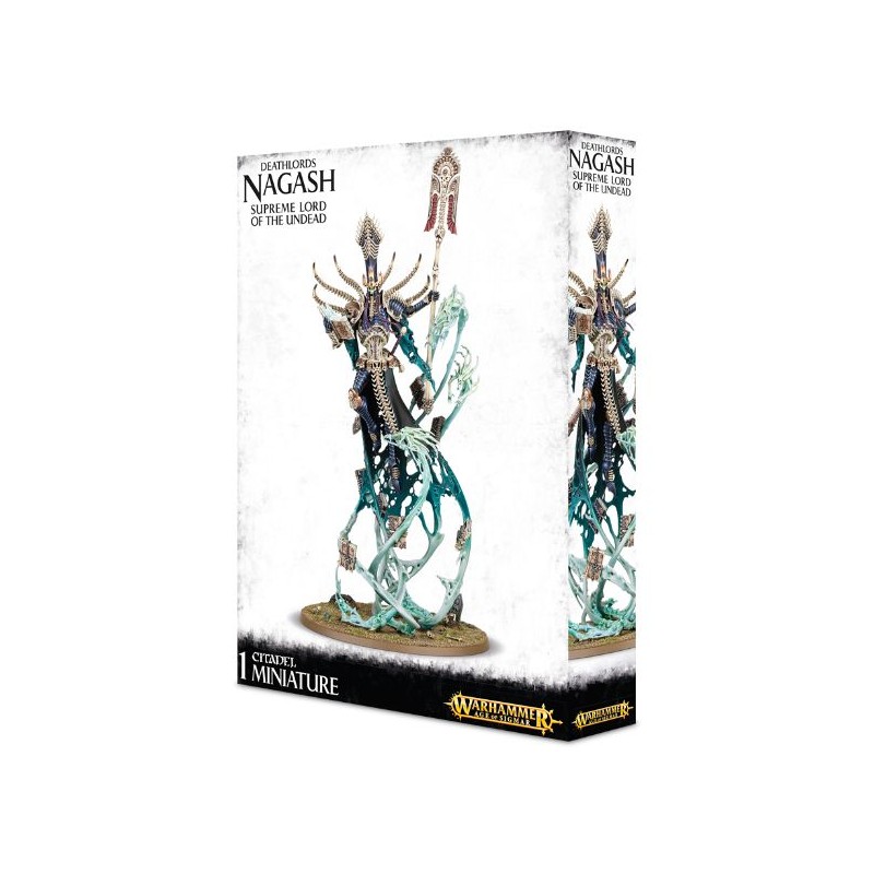 Ce kit plastique est équipé des plus précieux artéfacts de Nagash. Coiffé de la Couronne de Sorcellerie, il tient soit Alakanash, le Sceptre de Pouvoir, soit Zefet-nebtar, la Lame Mortis. Il est revêtu de Morikhane, l'Armure Noire, et tout autour de lui ses neuf antiques grimoires décrivent des orbites, chacun recélant les terribles secrets de la réanimation des morts.
