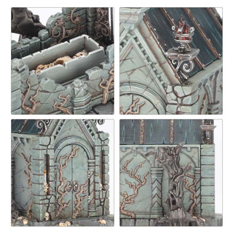 Ce kit en plastique permet d'assembler 3 éléments de terrain de faction pour créer un Sépulcre Maudit, un nexus d'énergies nécromantiques pour votre armée de Seigneurs Ruinemânes lors des parties de Warhammer Age of Sigmar. Ces sinistres structures offrent de nombreux avantages à votre armée de morts-vivants. Ils permettent de renforcer les sorts d'invocation et de soigner vos figurines quand le sang a été répandu sur leur sol impie.