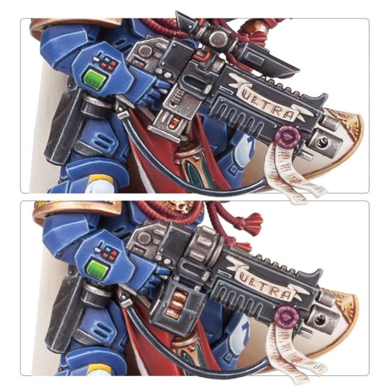 Le Primaris Captain se présente en 21 composants, et il est fourni avec un socle rond Citadel de 40mm. Le kit comprend aussi une planche de décalcomanies pour personnage Ultramarine, avec l'iconographie pour Captain, Chaplain, Librarian et Lieutenant.