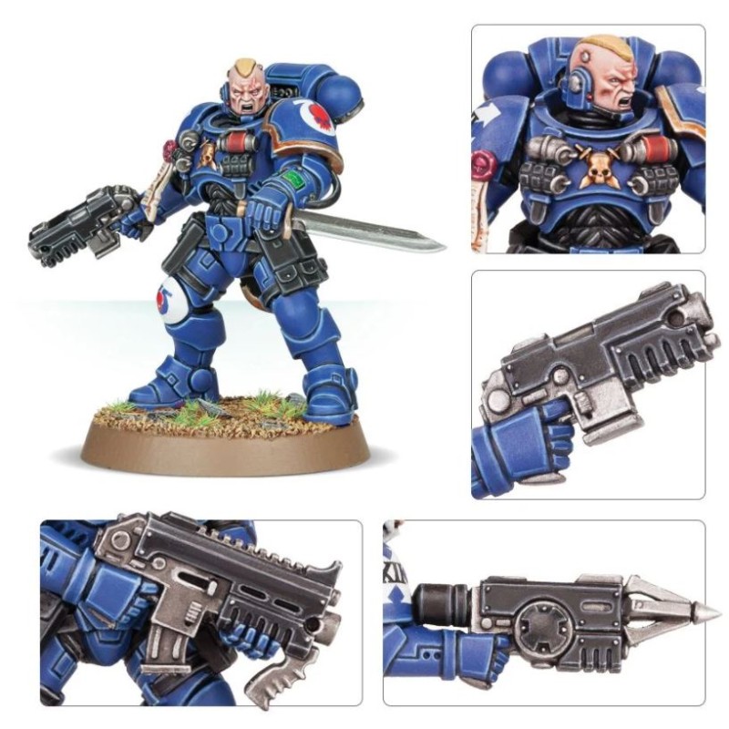On peut assembler les figurines sous forme d'escouade de 10, soit 9 Reivers plus un Sergeant, ou de 2 escouades de 5 Reivers chacune avec son propre Sergeant. L'éventail d'armes disponibles est impressionnant: 10 pistolets bolters lourds, 12 carabines bolters et 14 couteaux de combat sont fournis, en associant soit carabine, soit pistolet et carabine, soit pistolet et couteau de combat. 2 des paires de bras pour couteau de combat comportent un appareil de communication sur l'avant-bras, à l'usage des Sergeants. Les carabines bolters ont l'air martial avec leur poignée frontale et leur chargeur courbe, et 2 d'entre elles sont représentées en train d'être rechargées. Chaque figurine peut aussi avoir un lance-grappin – il y en a 10 dans leur étui, plus 4 tenus dans la main droite.