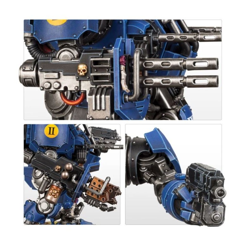 Comme nombre d'unités Primaris Vanguard, une Invictor Tactical Warsuit a la capacité de se dissimuler dans une position hors de votre zone de déploiement, ce qui lui confère un avantage unique sur tout autre véhicule de classe Dreadnought de l'arsenal space marine. Elle dispose de puissantes options d'armement: si vous recherchez l'appui feu à longue portée, il y a l'autocanon Ironhail jumelé. Si vous préférez aller au contact direct de l'adversaire, vous préférerez le canon Incendium. Elle porte également un bolter lourd qu'elle peut manier tel un pistolet pour tirer en mêlée à bout portant, tout en broyant ses ennemis avec son terrible gantelet Invictor.