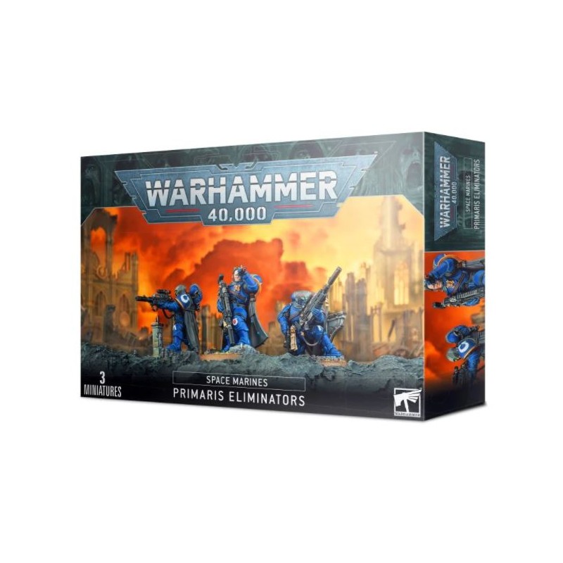 Ce kit plastique en 60 composants permet d'assembler trois Eliminators, fournis chacun avec un socle rond Citadel de 40mm. Le tout comprend en outre une planche de décalcomanies d'infanterie Space Marine Primaris.