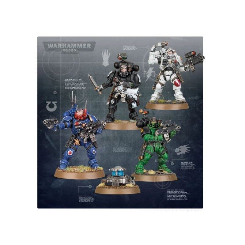 Ce kit contient deux grappes identiques, composées chacune de cinq figurines pouvant être montées en tant qu'Infiltrators ou Incursors. Le tout comprend 266 composants au total, 10 socles ronds Citadel de 32mm et une planche de décalcomanies pour infanterie space marine.
